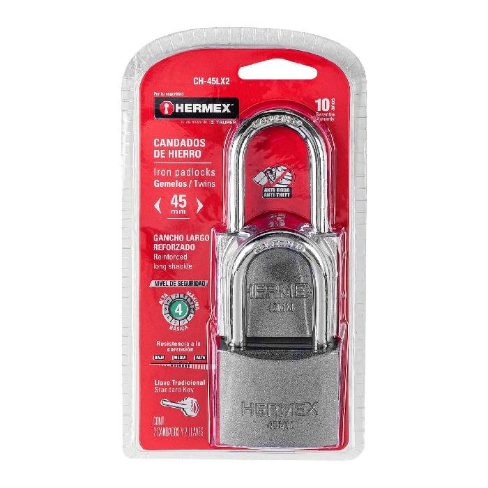 Blíster con 2 candados de hierro de 45mm con gancho largo 43330
